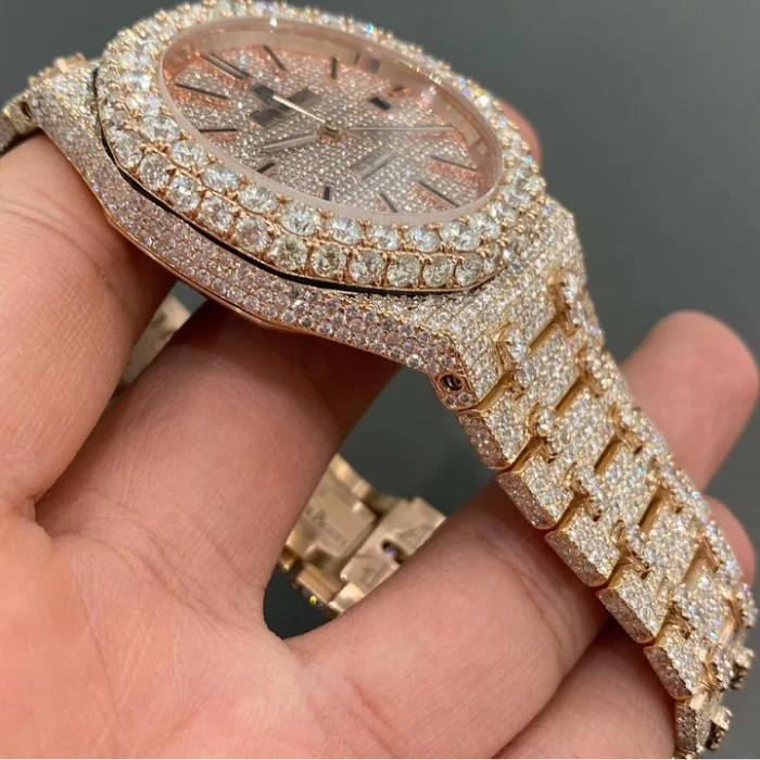 Check out this 42mm Audemars Piguet Royal Oak Watch —built to excellence with a stainless steel body and rose gold finish. Fully iced out  Moissanite Bust Down AP Watch with VVS Moissanite diamonds that pass a diamond tester, it gets that elegant look which makes all eyes turn toward it.