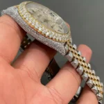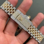 To enhance its presence, the watch is fully iced out with moissanite diamonds, meticulously set across the bezel, case, and bracelet. Known for their diamond-like brilliance and fire, moissanite stones radiate luxury while being eco-friendly and more accessible than traditional diamonds. The iced-out finish transforms the Datejust into a bold statement piece without losing the elegance that makes Rolex watches universally admired.