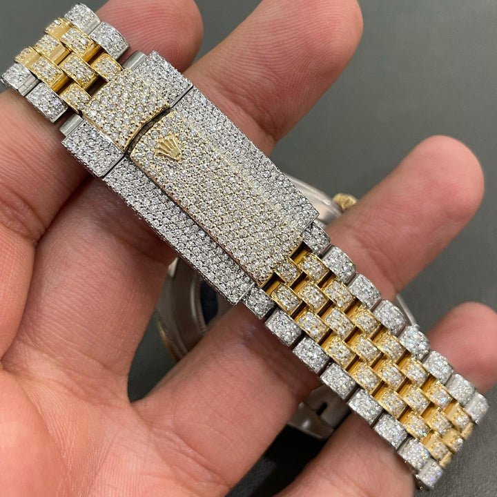 This Rolex Datejust Roman Dial has a full Buss Down Iced Out Moissanite Watch. It is a dual-tone Rolex Watch. This Rolex has a big diamond bezel. Set with only VVS Diamonds. This VVS Diamond is handset by our craftsman.